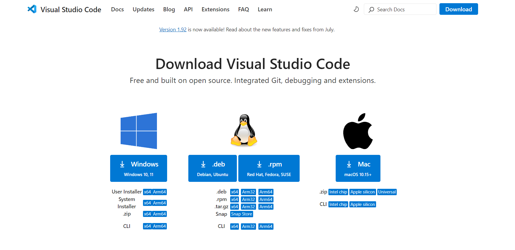 前往 Visual Studio Code 官网。你应该会看到和下图类似的页面:
